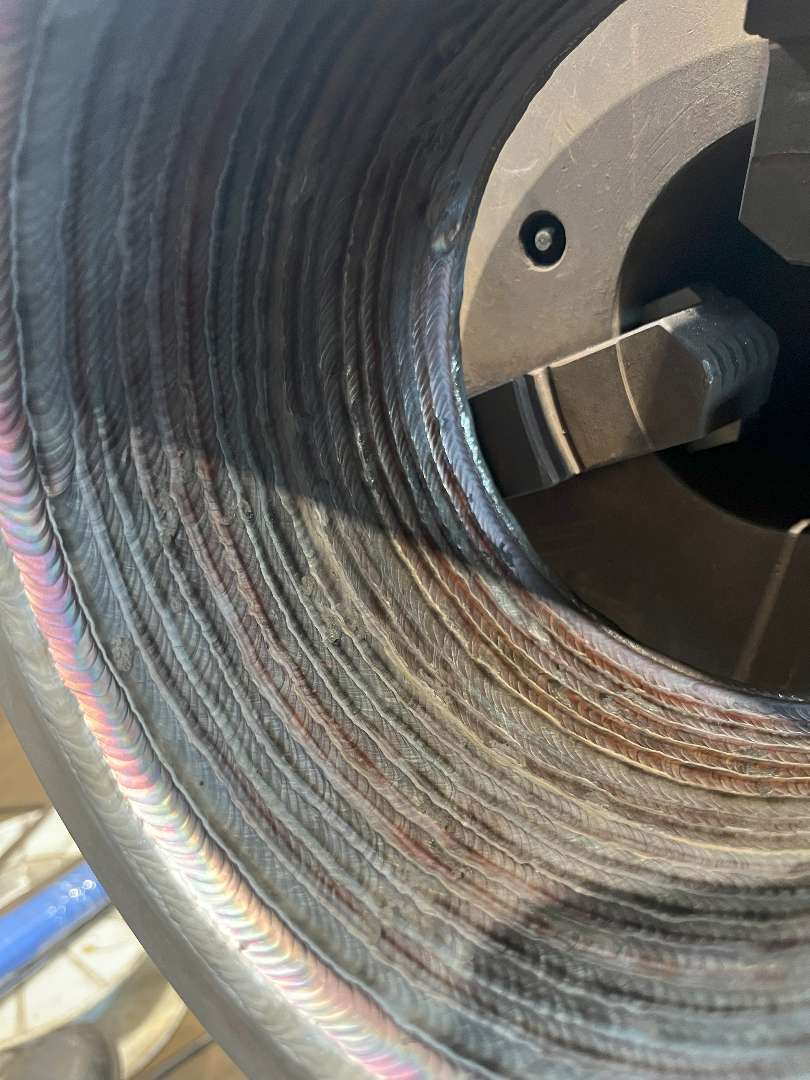 工場・プラント 北九州市若松区 特殊合金肉盛り リングの内面へ特殊合金肉盛りのご依頼をいただきました。内径はφ150、L130、仕上がりの肉厚は3mmとなっております。 場所 福岡県北九州市 次の施工事例 工場・プラント 北九州市若松区 スリーブ継ぎ開先溶接